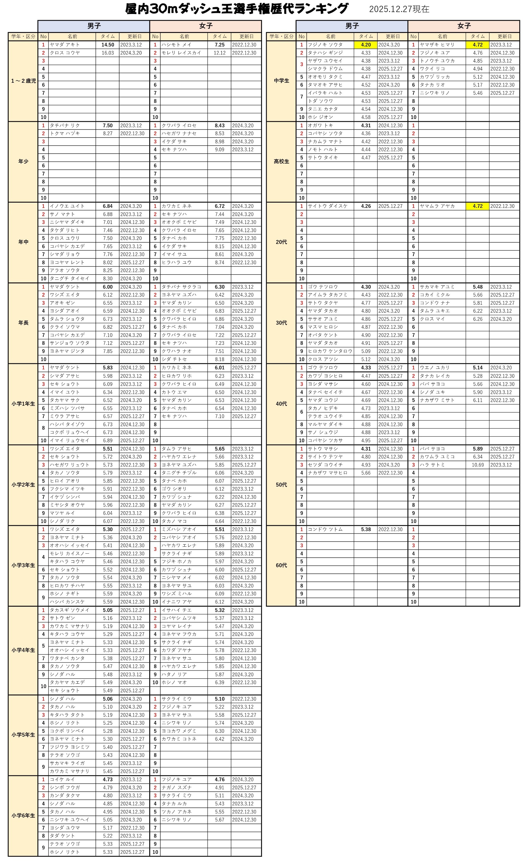 第5回 屋内30mダッシュ王選手権の結果(ランキング3位まで)と歴代ランキングを発表します! ご参加いただきました皆さま、ありがとうございました。