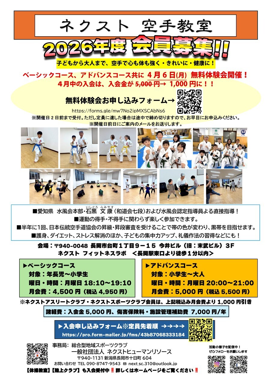 申し込みが多かった場合は締め切ります。※体験会参加から入会された場合、 入会金が5,000円 4,000円に!